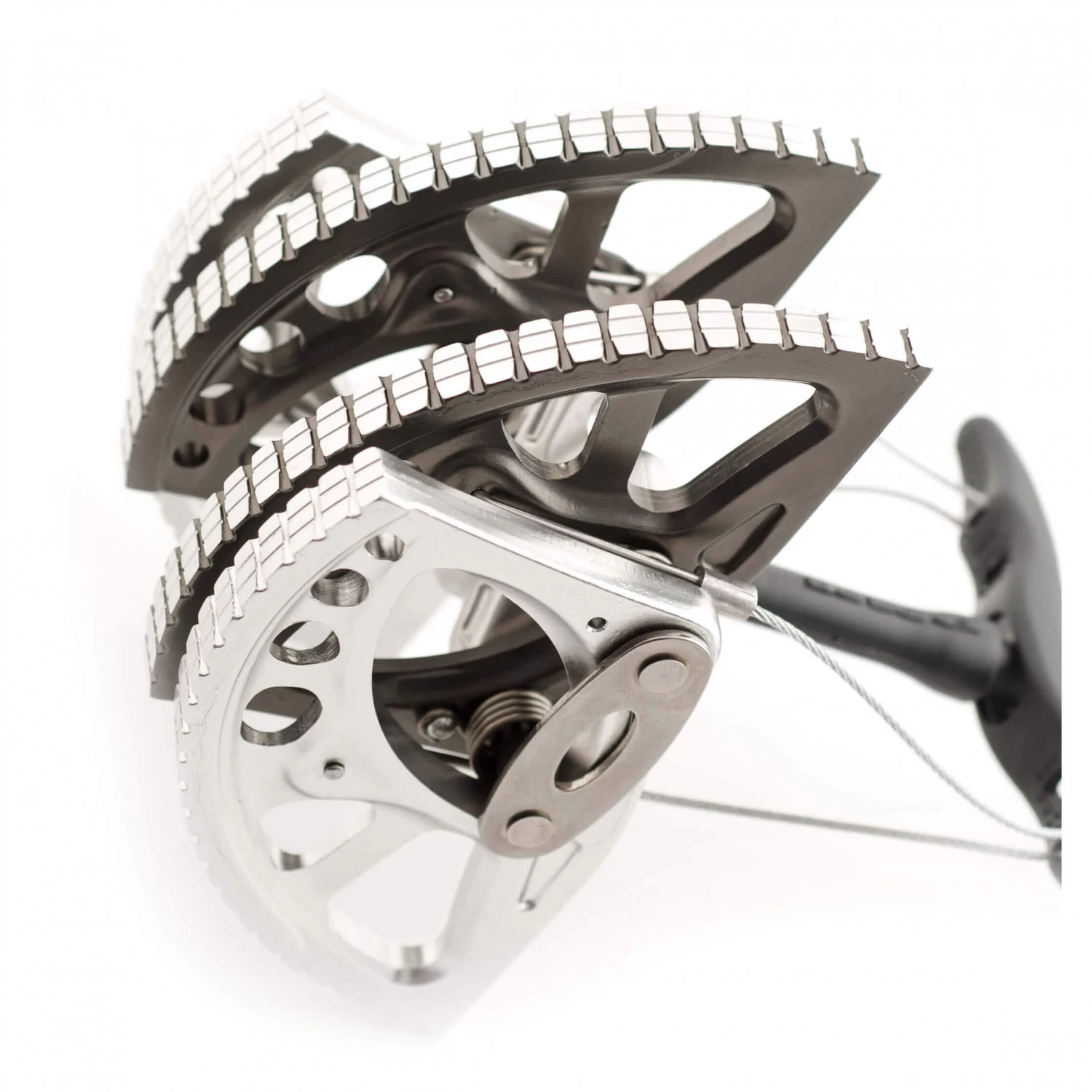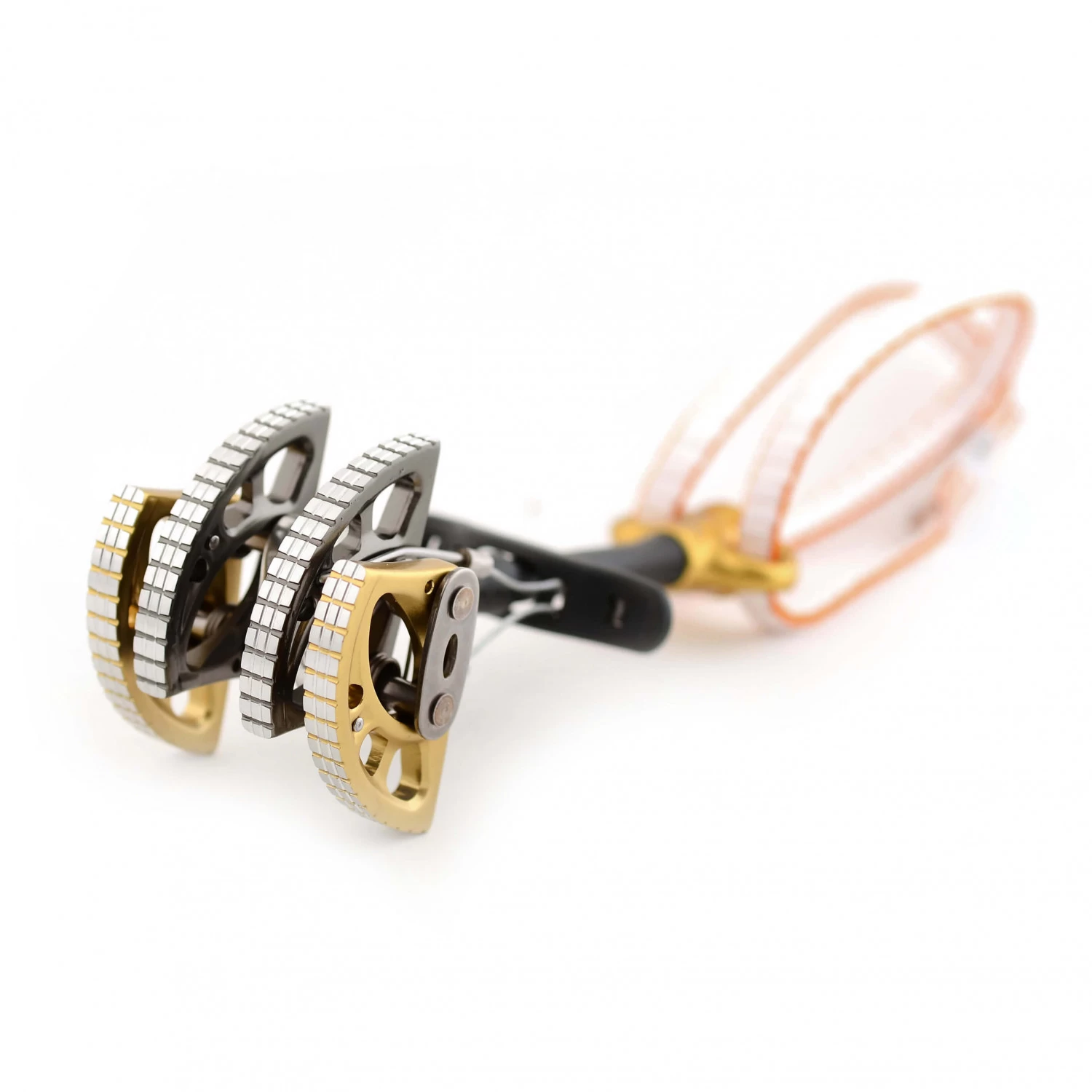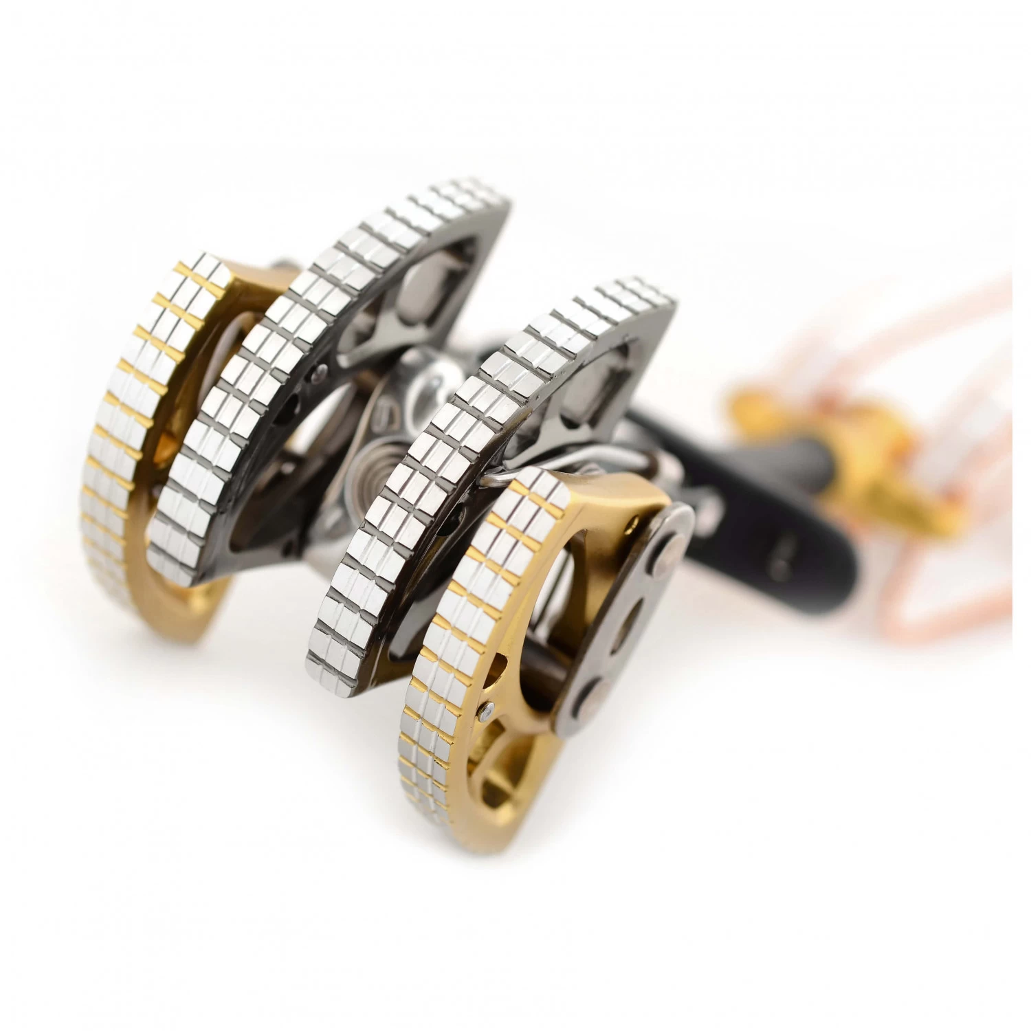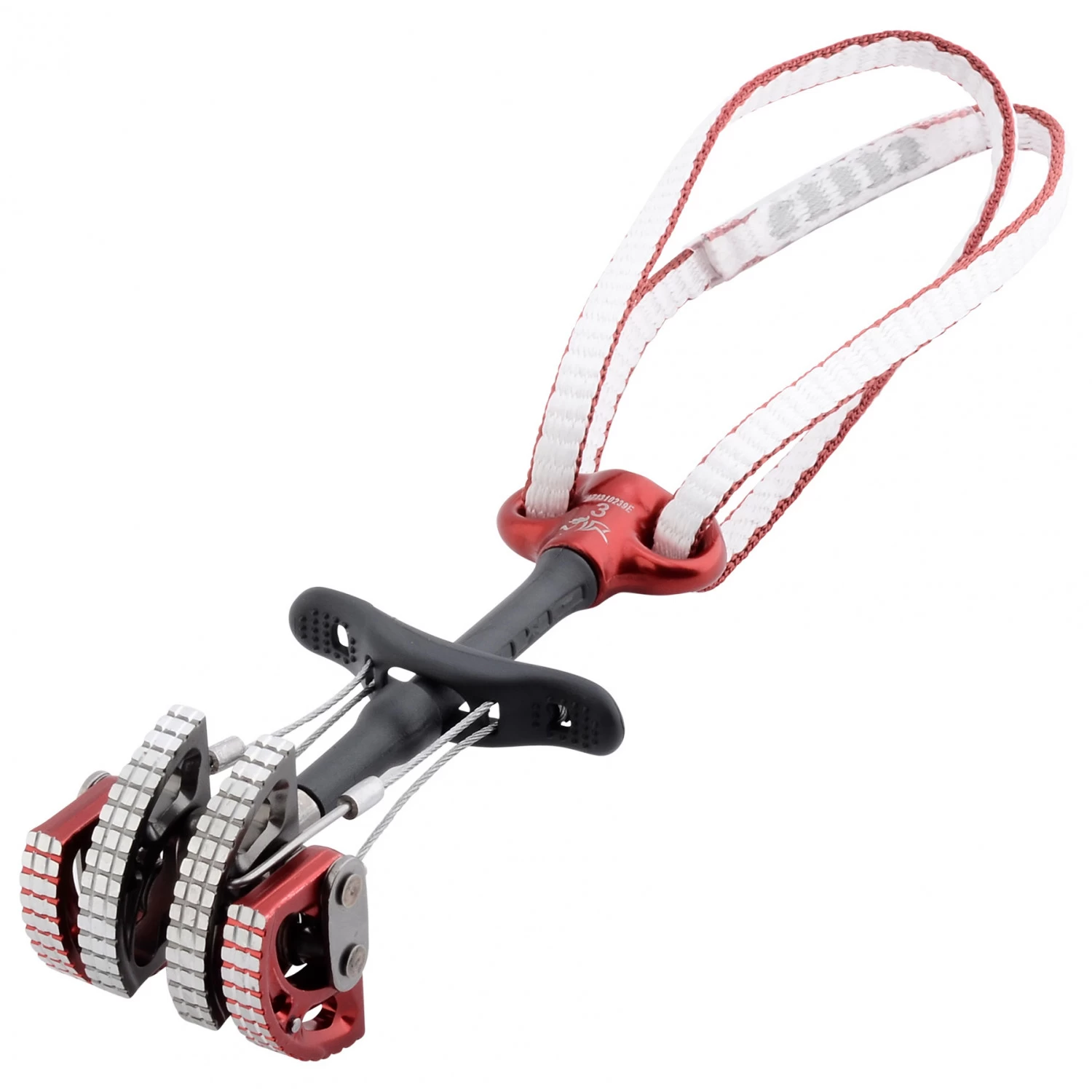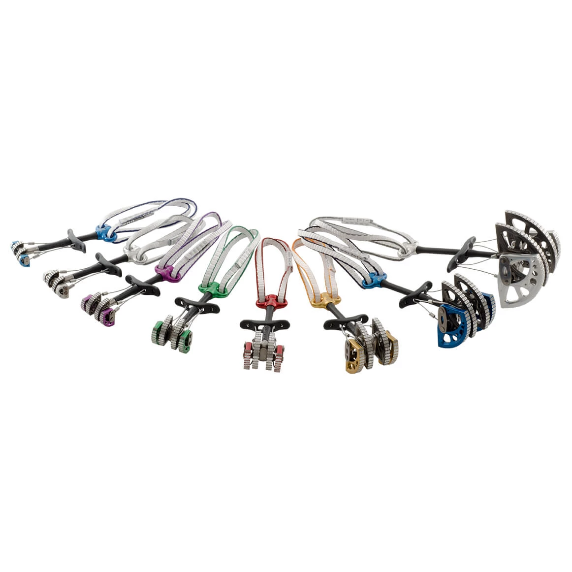 Der Dragon 2 ist ein aktives Klemmgerät mit Doppelachs-System und einfachem Steg. Diese Konstruktion wiegt weniger als ein Zwei-Stege-Klemmgerät und bietet ebenfalls die Möglichkeit einer passiven Platzierung (Cam wird wie ein Klemmkeil gelegt, nicht aktiv in Spalt gesetzt). Den große Vorteil des Dragon 2 offenbart ein Blick auf die heißgeschmiedeten Klemmsegmente. Die Oberfläche ist im Kontaktbereich zum Fels CNC-gefräst und mit einer Triple Grip Struktur versehen. Dadurch finden die Segmente in kleinsten Felsstrukturen Halt und wandern nicht so leicht im Riss. Die 8 mm Dynatec Schlinge lässt sich wahlweise kurz oder lang verwenden. So kann man seine Zwischensicherungen verlängern, um den Seilverlauf zu begradigen, ohne dafür zusätzliche Expressen oder Schlingen mitzunehmen. So spart man sich das entscheidene Gewicht in schwierigen Tradrouten und langen Alpintouren!