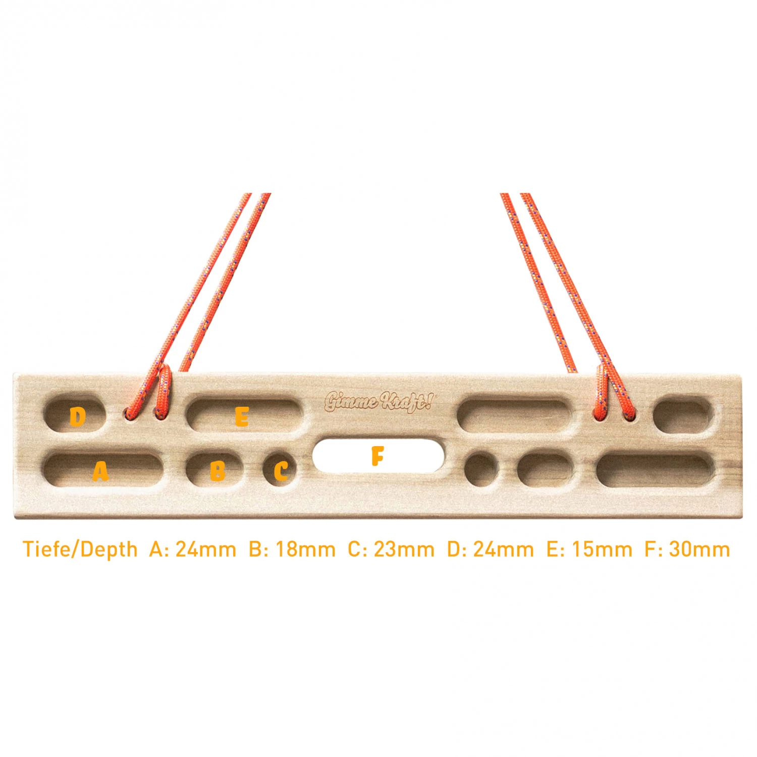 Verschiedene Lochgrößen und Tiefen der Leisten bieten individuelle Trainingsmöglichkeiten für Fortgeschrittene bis Profis. Die mittlere Leiste ist zur Rückseite hin offen und dient als Henkel, z.B. für Unterstützung bei einarmigen Klimmzügen.
