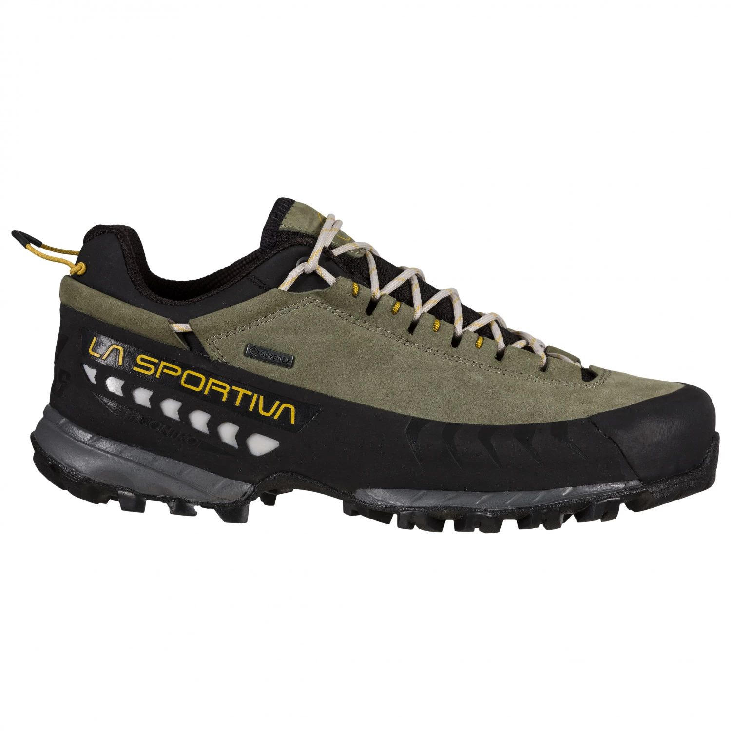 Für den Einsatz in anspruchsvollem Terrain hat La Sportiva die Women’s TX5 Low GTX Approachschuhe besonders robust konstruiert. Der Schaft aus Nubukleder wird ringsum von einem breiten Geröllschutzrand geschützt, der effizient Beschädigungen durch Steine, Wurzeln und Geröll verhindert. Selbst schmale Zustiege und Klettersteige sind dadurch kein Problem für den strapazierfähigen Zustiegsschuh. Im Inneren sorgt dabei die GORE-TEX Extended Comfort Membran für zuverlässigen und dauerhaften Nässeschutz und hohe Atmungskaktivität. Der wasserdichte Women’s TX5 Low GTX ist mit einer komfortablen und sehr griffigen Sohlenkonstruktion ausgerüstet, die sowohl im Aufstieg, als auch im Abstieg, jederzeit besten Halt und volle Kontrolle gewährleistet. Dafür kombiniert La Sportiva eine abriebfeste MegaGrip Sohle von Vibram mit einer stabilisierenden Brandsohle, EVA Dämpfung und einer 4 mm Ortholite Approach Einlegesohle.