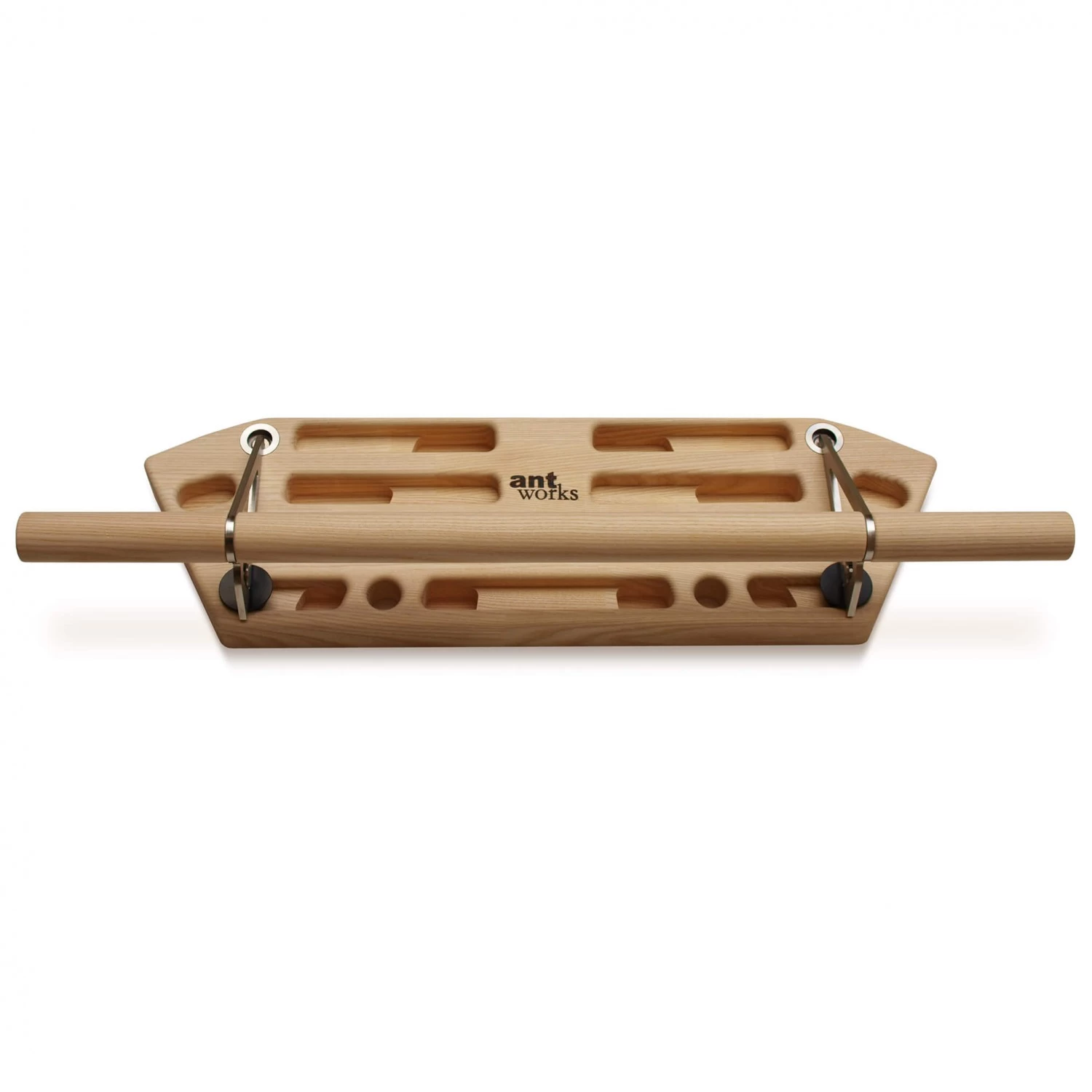 Ideal für heimische Trainingseinheiten – das Strong Ant III von Antworks! Gleich auf den ersten Blick überzeugt das Trainingsboard mit einem ausgeglichenen Design, das ganz ohne fallende Linien auskommt. Die klare Griffanordnung fordert einen dabei augenblicklich zum Hangeln ein, während die unterschiedlichen Grifftiefen (16 und 37 mm) für wechselnde Herausforderungen sorgen. Die Fingerlöcher, sowie die Oberkante kommen mit einer Tiefe von 40 mm. Alle Kanten sind mit einem Radius von 6 mm abgerundet. Zu guter Letzt sei dann noch das hochwertige Material erwähnt: ganz egal wie sehr man die Finger beim Training auch quält, das geschliffene Eschenholz des Antworks Strong Ant III Trainingsboards ist ein echter Hautschmeichler!
